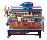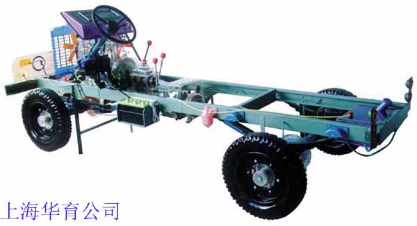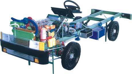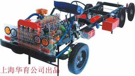本品選用透明有機玻璃制作,內中部件均以硬質塑料料加工,用 螺絲固定在金屬高溫烘漆而成的車架上。各總成部分都以壓模成形加 工,代替過去膠粘合的方法,使產品在強度上有很大提高。發(fā)動機總成用電機驅動,在油門處設有調速裝置,能演示發(fā)動機轉速高低。離合器分離明顯,操縱靈活,離合器外殼整體壓模而成,變速箱和各檔齒輪用各種顏色表示,換檔靈活,手制動美觀。后橋外形壓模而成,內中主減速、差速轉動自如,輪轂剎蹄壓模成型,剎蹄可調節(jié),前橋輪鼓可調整,轉向裝置以及電瓶、油箱、水箱,制動管路分布清楚一目了然。電路采用對插件前后分布,燈架、風窗、儀表板、后燈架用透明有機玻璃壓模成整體美觀逼真。