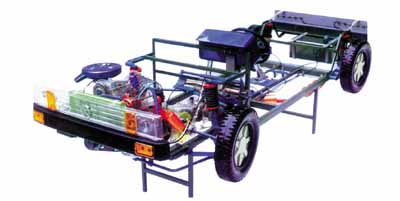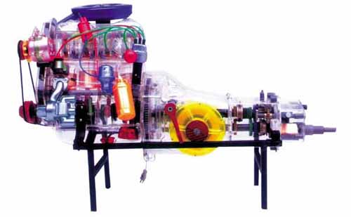 本品選用透明有機(jī)玻璃制作,內(nèi)中部件均以硬質(zhì)塑料料加工,用 螺絲固定在金屬高溫烘漆而成的車(chē)架上。各總成部分都以壓模成形加 工,代替過(guò)去膠粘合的方法,使產(chǎn)品在強(qiáng)度上有很大提高。發(fā)動(dòng)機(jī)總成用電機(jī)驅(qū)動(dòng),在油門(mén)處設(shè)有調(diào)速裝置,能演示發(fā)動(dòng)機(jī)轉(zhuǎn)速高低。離合器分離明顯,操縱靈活,離合器外殼整體壓模而成,變速箱和各檔齒輪用各種顏色表示,換檔靈活,手制動(dòng)美觀(guān)。后橋外形壓模而成,內(nèi)中主減速、差速轉(zhuǎn)動(dòng)自如,輪轂剎蹄壓模成型,剎蹄可調(diào)節(jié),前橋輪鼓可調(diào)整,轉(zhuǎn)向裝置以及電瓶、油箱、水箱,制動(dòng)管路分布清楚一目了然。電路采用對(duì)插件前后分布,燈架、風(fēng)窗、儀表板、后燈架用透明有機(jī)玻璃壓模成整體美觀(guān)逼真。
